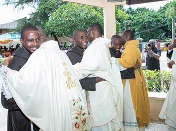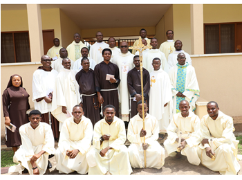A cross-section of friars at the ordination: (L-R) Brs Ikechukwu Monyei, Fidelis Pabor, Chinedu Nwachukwu, Newly Ordained, Godwin Igbokwe, Emmanuel Idakwo, Francis Eze, Kyrian Godwin, Adolphus Nwandu, and Tarasius Anyamene (center).